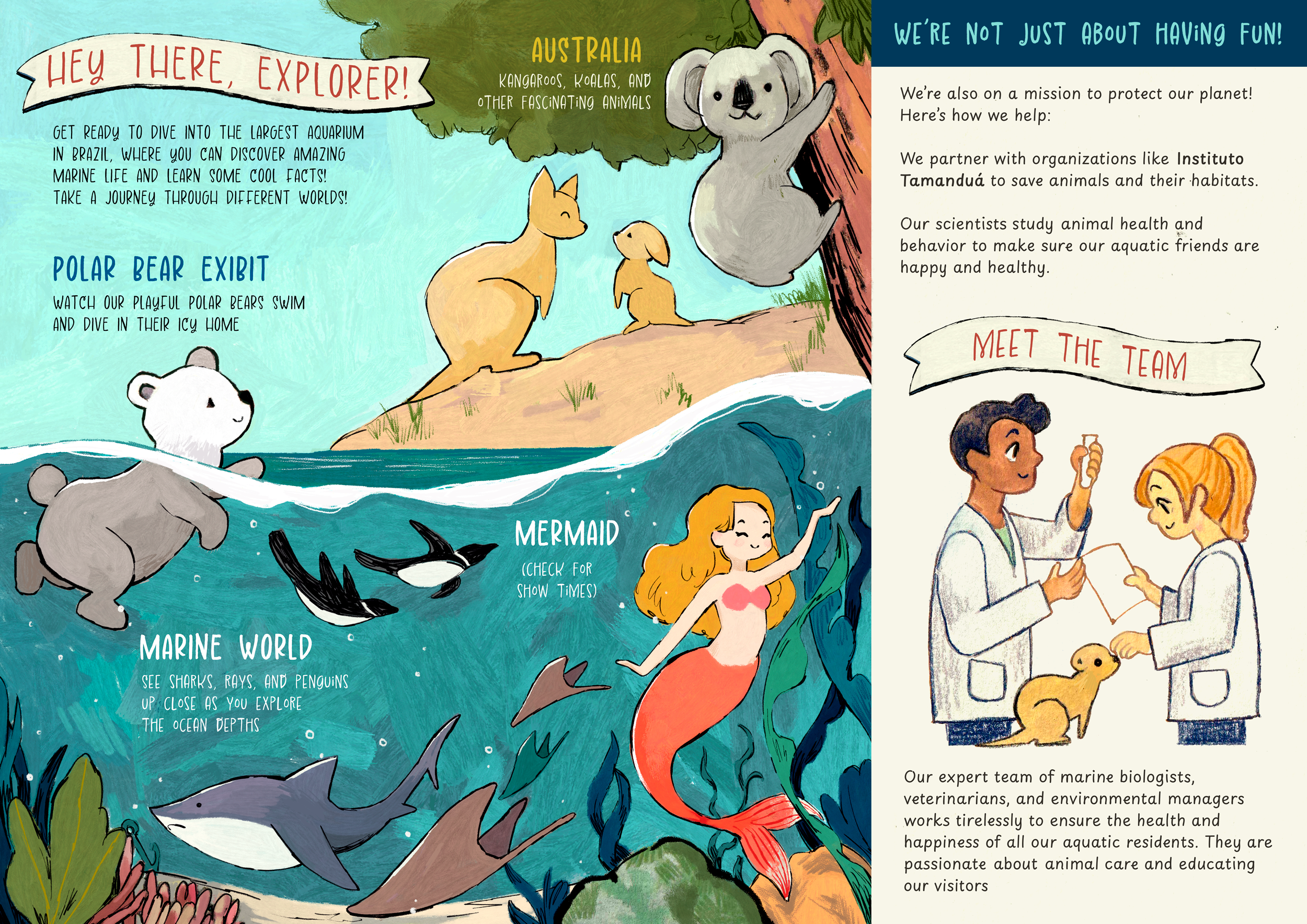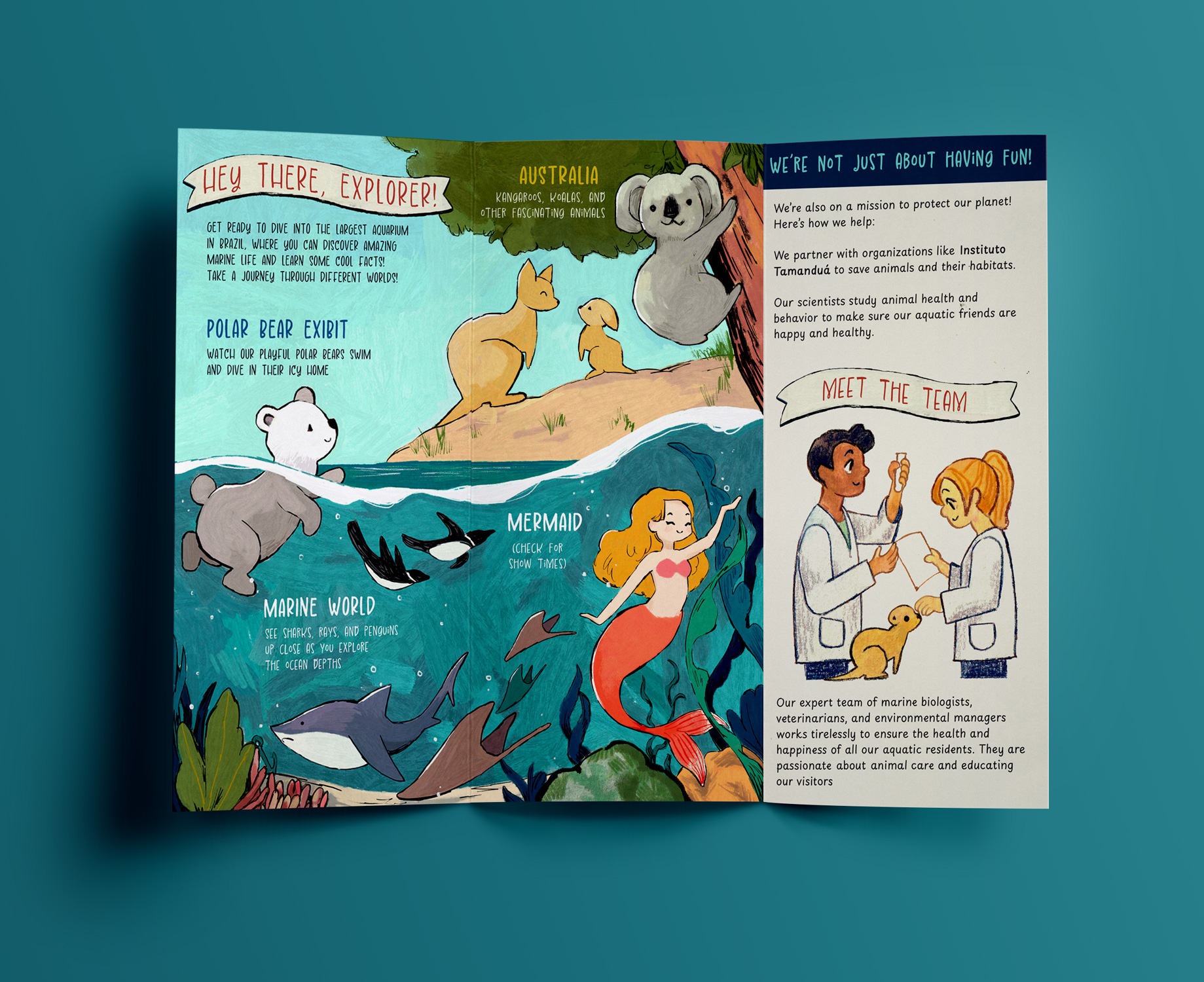 One of my favorite places to visit in São Paulo, Brazil, is the aquarium. It doesn’t only take care of water animals, but also many mammals. For this self initiated project, I wanted to create an illustrated tri-fold flyers.